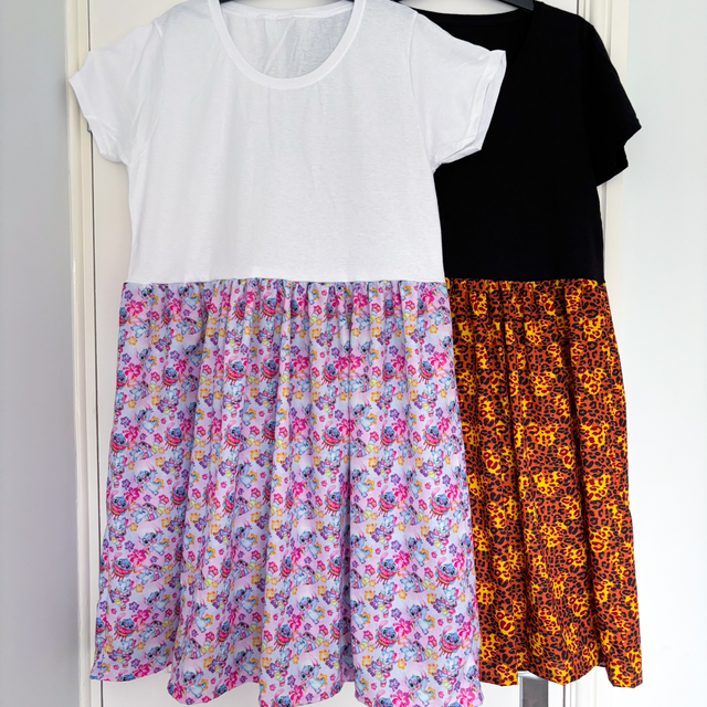 ✨ Disney inspired dresses made with a polycotton print and 100% cotton t shirt.